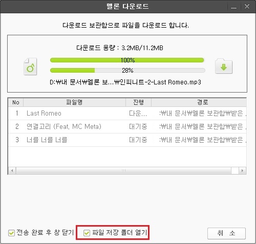 다운로드 진행 시 “파일 다운로드 후 폴더 열기”에 체크가 되어 있으면, 다운로드 완료 후, 해당 폴더가 자동으로 열립니다. 2. 멜론 윈도우 플레이어의 [Menu > 환경설정 > 다운로드]에서 폴더를 변경하거나 열 수 있습니다.