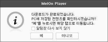 PC에 저장된 콘텐츠 메뉴 열기 팝업에서 “예”를 클릭하면 해당 메뉴의 탭이 자동으로 열립니다. 맥 플레이어에서 다운로드 한 곡들은 기본 저장 경로인 다운로드 > Melon 폴더 안에 저장됩니다. Finder에서 왼쪽 즐겨찾기 메뉴의 다운로드 폴더에서 Melon 폴더를 찾으시거나, Finder에서 상단 시스템 메뉴 > 이동 > 폴더에서 ~/Downloads/melon을 입력하시면 해당 폴더로 이동합니다.