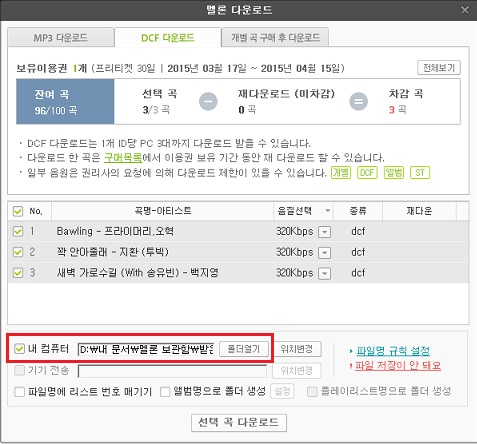 꼭 확인하세요. 멜론 웹사이트 또는 멜론 윈도우 플레이어에서 다운로드한 곡들은 기본 저장 폴더 (내문서 > 멜론보관함 > 받은 파일함)에 저장됩니다.