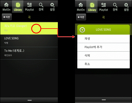 확인하실 수 있습니다 2. 곡 리스트에서 곡명을 롱터치 하시면 팝업메뉴가 노출됩니다. 팝업메뉴에서