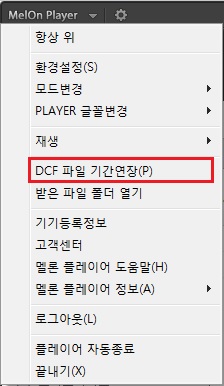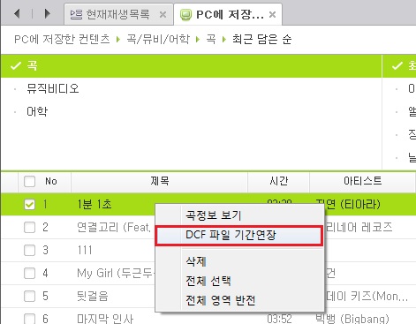2. 또는, PC 플레이리스트에서 곡을 선택한 후 마우스 오른쪽 버튼을 클릭해 [DCF 파일 기간연장]을 선택합니다.