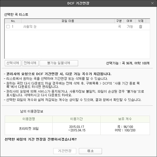 기간연장은 선택한 곡에만 적용되며, 기간연장 성공 시 보유 개수에서 차감이 발생합니다. 권한이 없거나 음원 파일이 손상되어 선택할 수 없는 상태로 노출되는 곡은 삭제 후 재다운로드 해주세요.