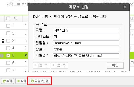 ※ 곡정보 변경 pop up에서 수정완료 후, [확인] 버튼을 클릭하면 곡 정보가 수정됩니다. ※ DCF파일로 컨버팅하는 곡의 정보만 수정되며, 해당 MP3 파일의 태그 정보 자체는 수정되지 않습니다.