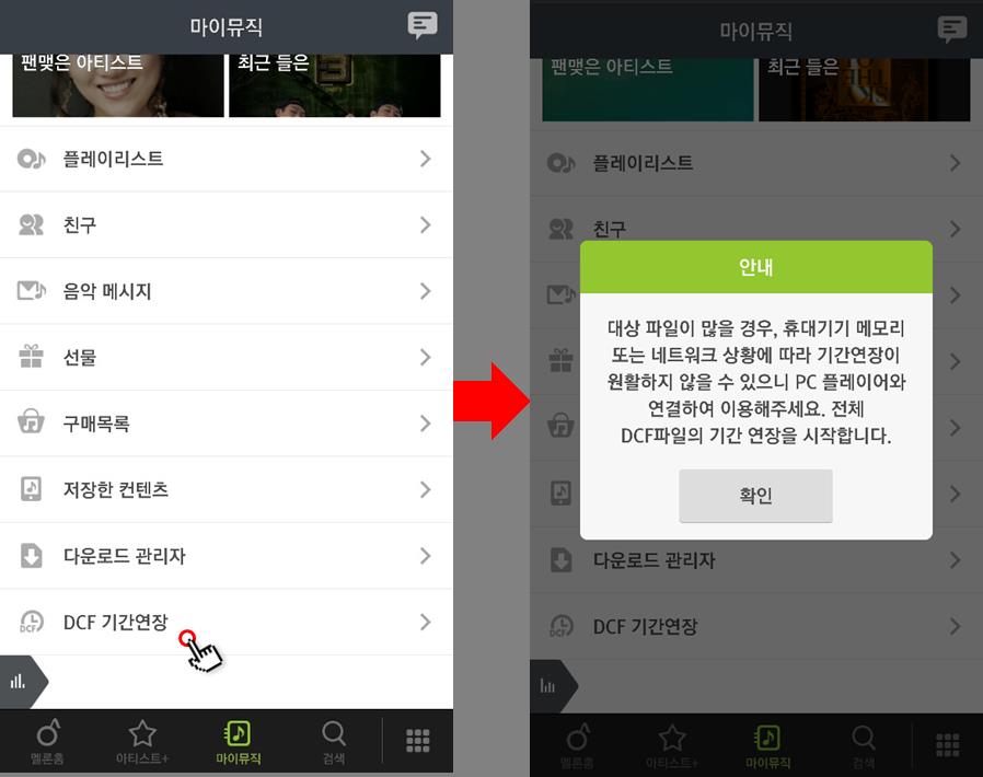 [DCF 무제한 이용권을 사용한 경우] 마이뮤직> [DCF 기간연장]을 선택하면 전체 기간 연장이 가능합니다. 기간만료 된 DCF 파일을 재생하면 자동으로 기간 연장이 됩니다.