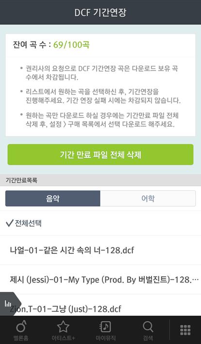 [DCF 다운로드 제한 이용권 (프리100)을 사용한 경우] - 잔여 곡 수가 남아 있는 경우에 기간 연장하실 수 있습니다. 마이뮤직> [DCF 기간연장]을 선택하면, 기간 만료 파일을 전체 삭제 하거나 일부 파일을 선택해서 기간 연장하실 수 있습니다. - 기간만료 된 DCF 파일을 재생하면 기간연장 여부를 선택할 수 있으며, [DCF 기간 연장]을 선택하면 여러 파일의 기간 연장 하실 수 있습니다. - [DCF 기간 연장] 완료 후, 기간 연장 실패 곡 리스트를 확인