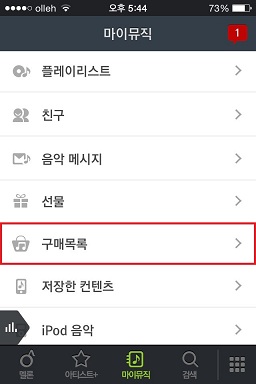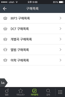MP3 이용권으로 다운로드, 개별 곡 구매, 앨범 구매한 곡은 구매 목록에서 다운로드 받아 이용할 수 있으며, DCF 이용권으로 다운로드 한 곡은 이용권 기간 동안만 재다운로드 및 사용이 가능합니다. 구매 목록에서 다운로드 받은 파일은 마이뮤직의 저장한 콘텐츠에서 확인할 수 있으며, 오프라인 모드에서도 이용할 수 있습니다.