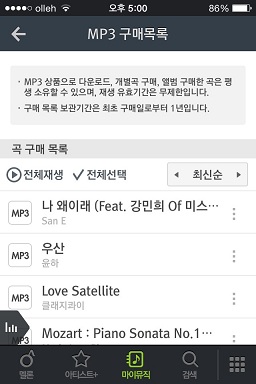 PC에서 다운로드 받은 파일은 마이뮤직의 구매목록을 통해서 다시 다운로드 받을 수 있습니다.