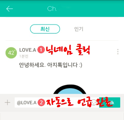 톡쓰기 창에서 닉네임을 눌러야만 정상적으로 언급이 된답니다.