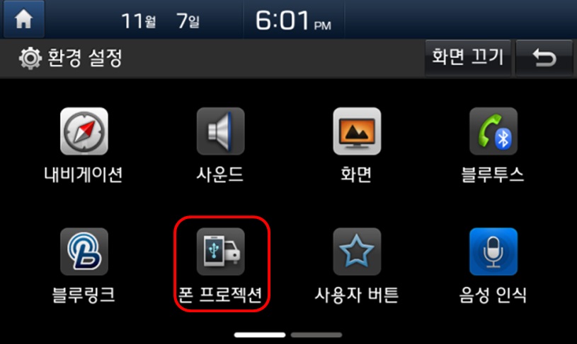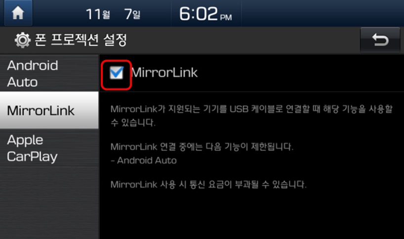 ② 환경설정 항목 내 폰 프로젝션 선택해주세요. ③ MirrorLink항목에서 체크를 해주세요.