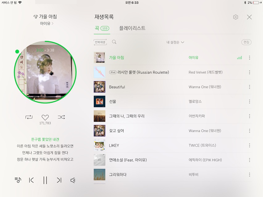3. 우측의 플레이어에는 현재 재생 중인 곡이 표시되며 좌측으로 스와이프하면 현재재생목록 전체를 볼 수 있습니다.